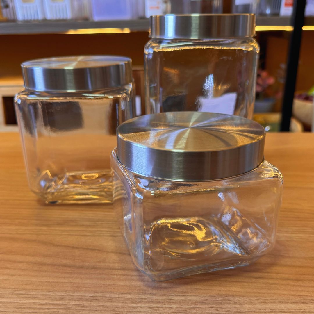 Com três potes de vidro claro nas capacidades de 790 ml, 1,2 litros e 1,6 litros, ele se ajusta lindamente às suas necessidades — arroz daquele saco grande, café que você usa pouco, biscoitos, o que você quiser