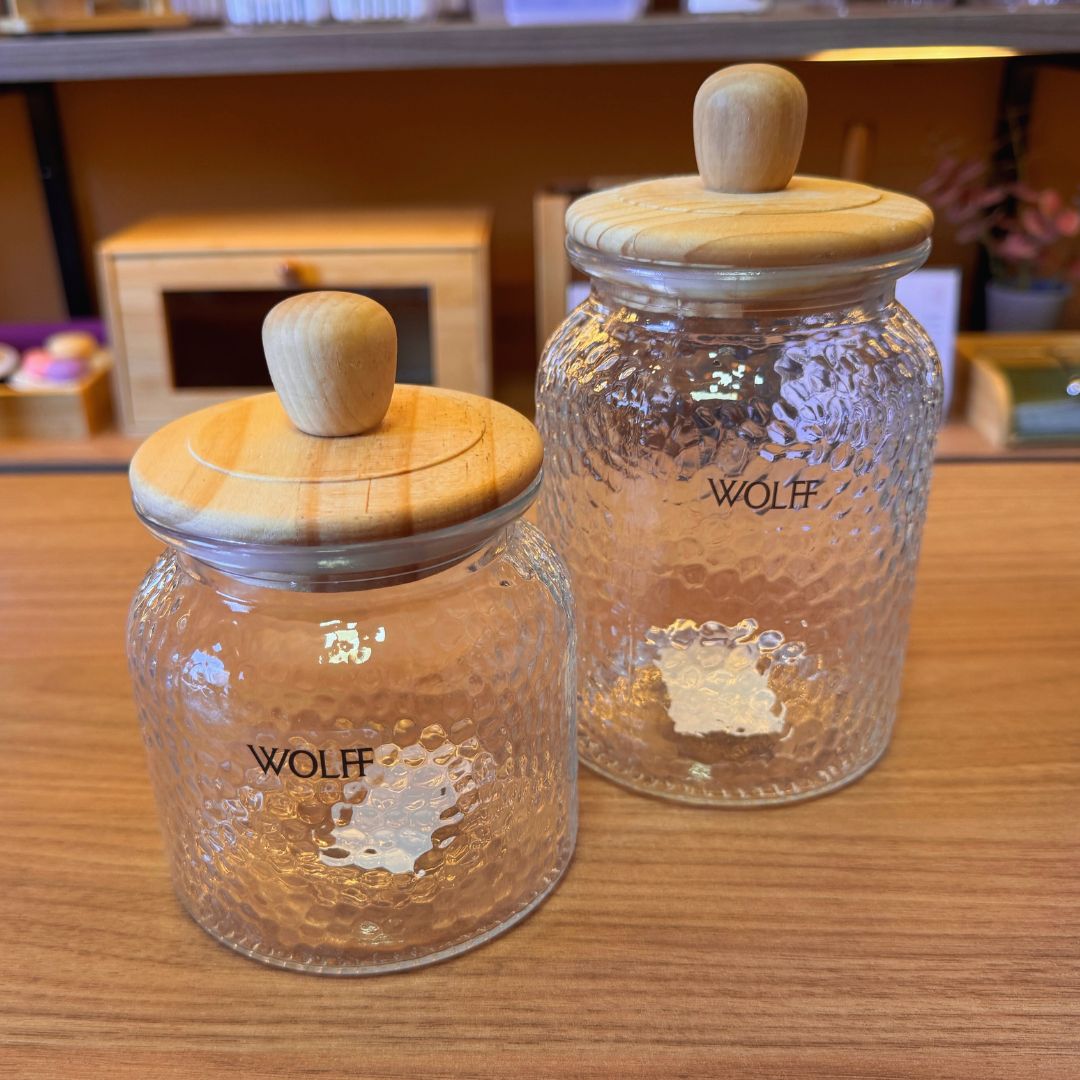 Este kit reúne dois potes em vidro martelado da linha Wolff — um de 1,0 L e outro de 0,64 L — ambos com tampas de bambu elegantes