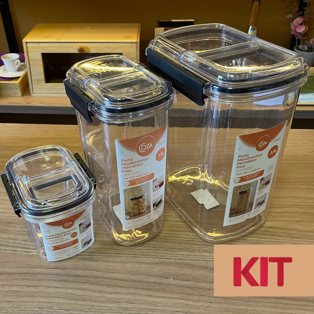 Este kit reúne três tamanhos complementares da linha Easy da Coza — os modelos de 750 ml, 1,5 L e 3,9 L — pensados para atender diferentes necessidades de armazenamento com estilo e praticidade
