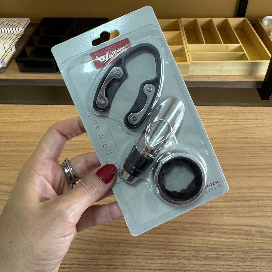 "Quer aquele toque de mestre nas suas taças? Este kit reúne tudo o que você precisa: dosador, anel de garrafa e corta lacres — é o trio perfeito para servir com estilo do começo ao fim!"