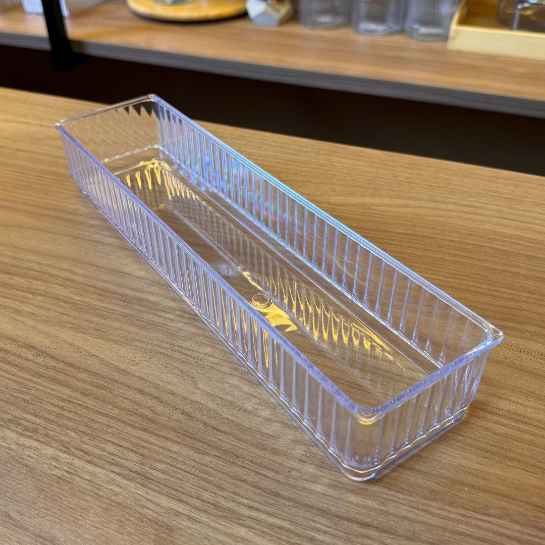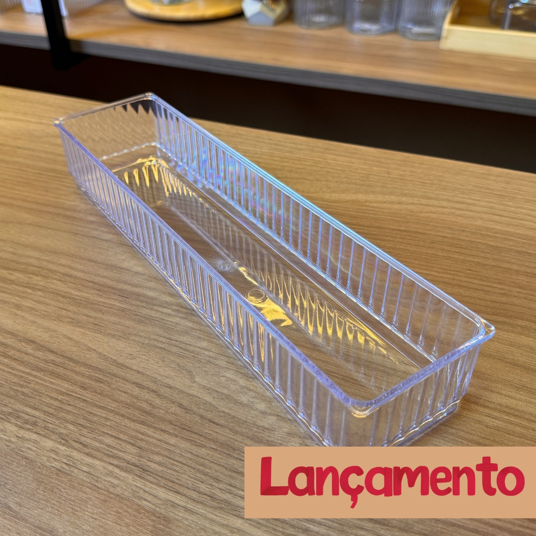 Material transparente “cristal” canelado — visibilidade total do conteúdo e acabamento refinado