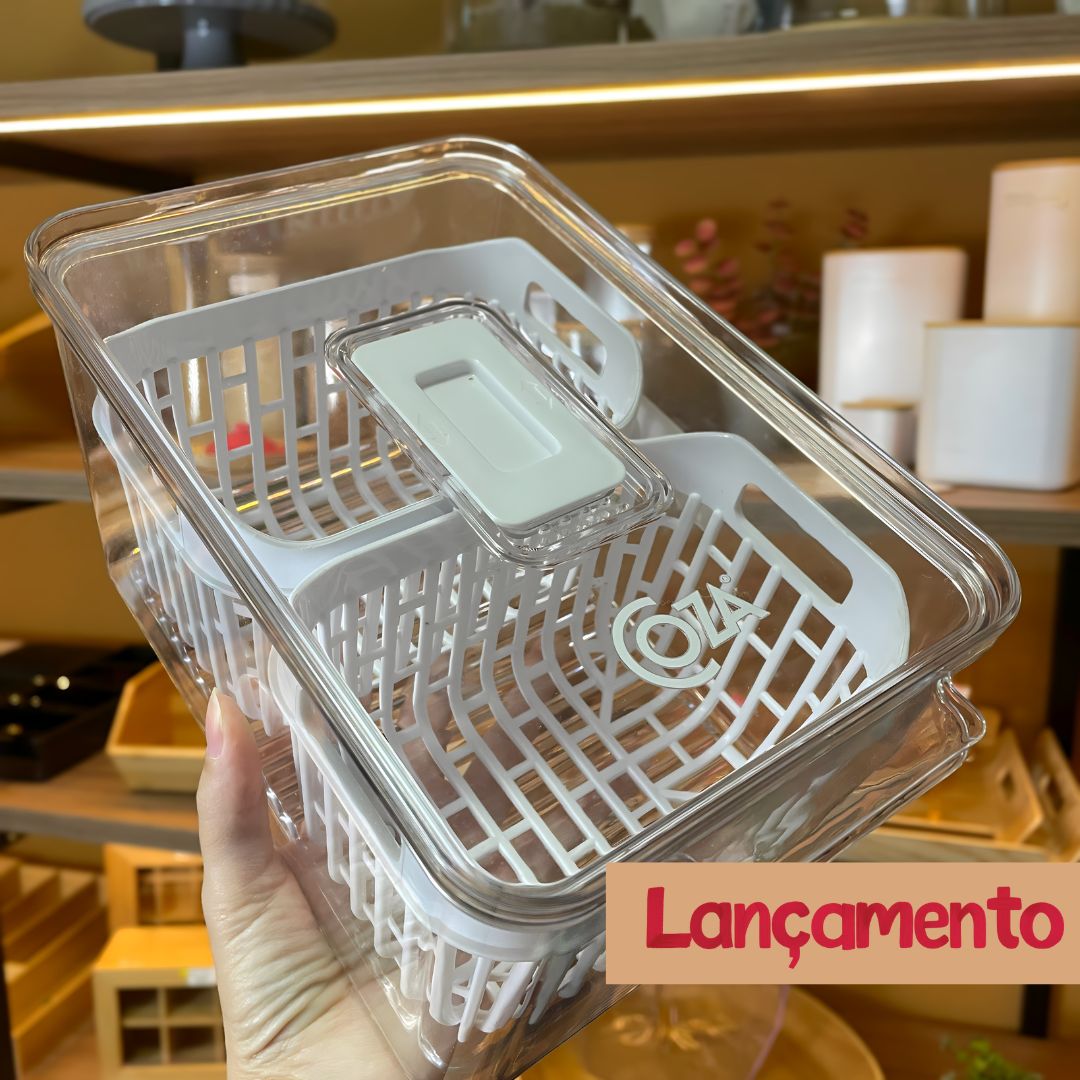 "Se a sua geladeira anda bagunçada ou você só perde tempo procurando o que precisa, esse pequeno organizador de 3,2 L com 2 cestos vai te salvar — ideal para quem quer praticidade e facilidade no dia a dia sem abrir mão de estilo. É perfeito para separar frutas pequenas, legumes, queijos ou snacks, deixando tudo visível e fácil de pegar."