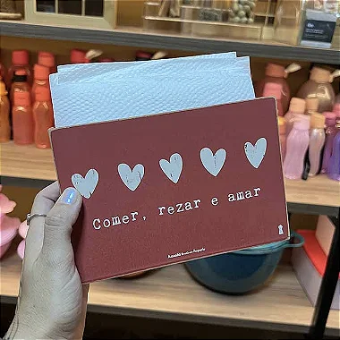 “Uma peça delicada que organiza e acolhe: escolha a frase que mais combina com sua casa — seja ‘Nesta Casa’ ou ‘Comer Rezar e Amar’ — e leve para sua mesa um toque de afeto todos os dias.”